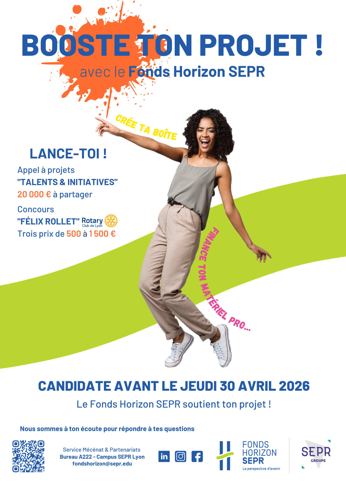 Vous avez besoin d’un coup de pouce pour concrétiser un projet de création d’entreprise ou un financement de matériel professionnel ? L’appel à projets BOOSTE TON PROJET ! , organisé par le Fonds Horizon SEPR et le Rotary Club de Lyon, en partenariat avec la SEPR, est pour vous.
